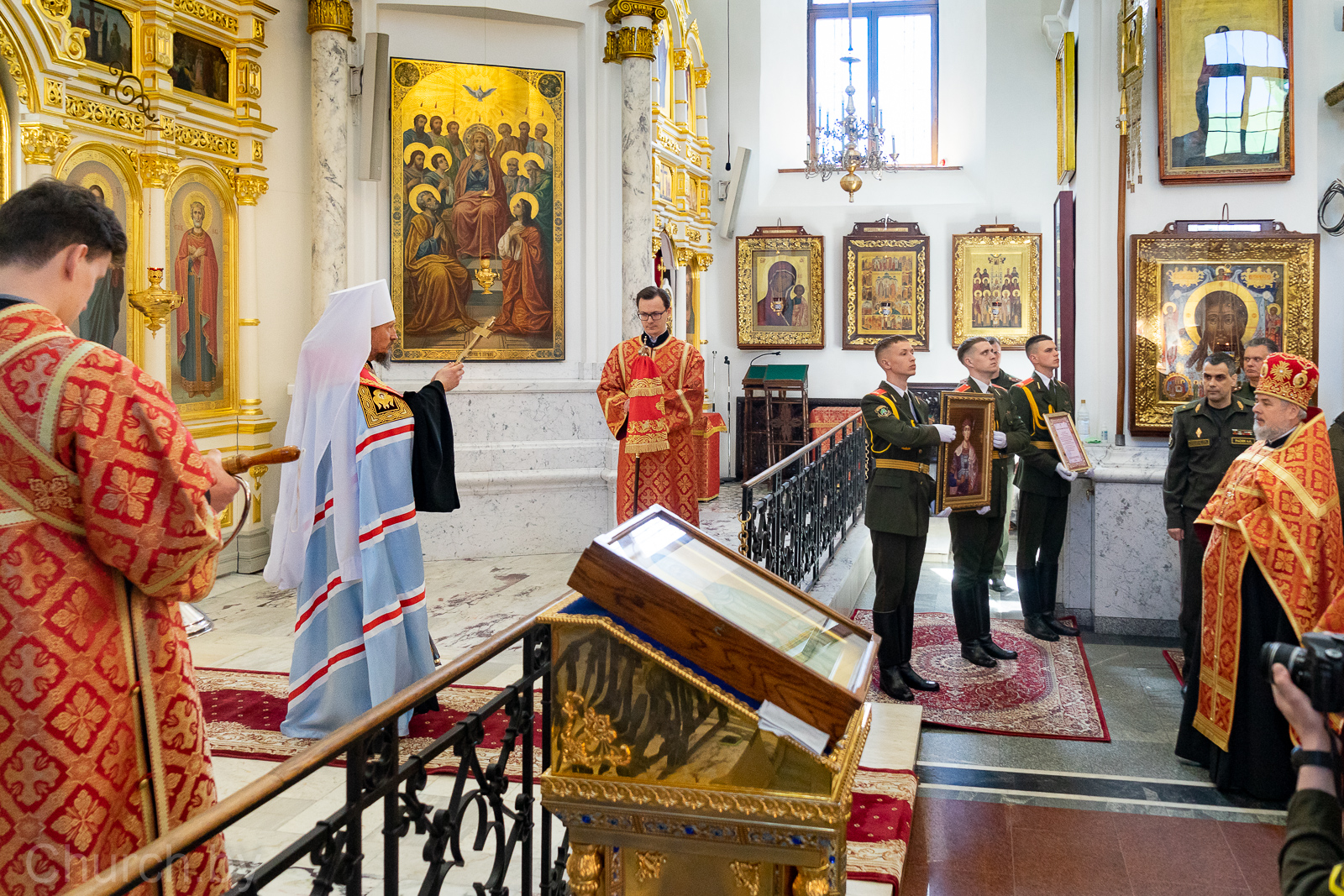 По окончании молебна Митрополит Вениамин обратился к собравшимся с архипастырским словом назидания. Затем Патриарший Экзарх передал освященную икону святого великомученика Димитрия Солунского начальнику Главного организационно-мобилизационного управления — заместителю начальника Генерального штаба Вооруженных Сил генерал-майору Андрею Расюку, который произнес благодарственное слово.
