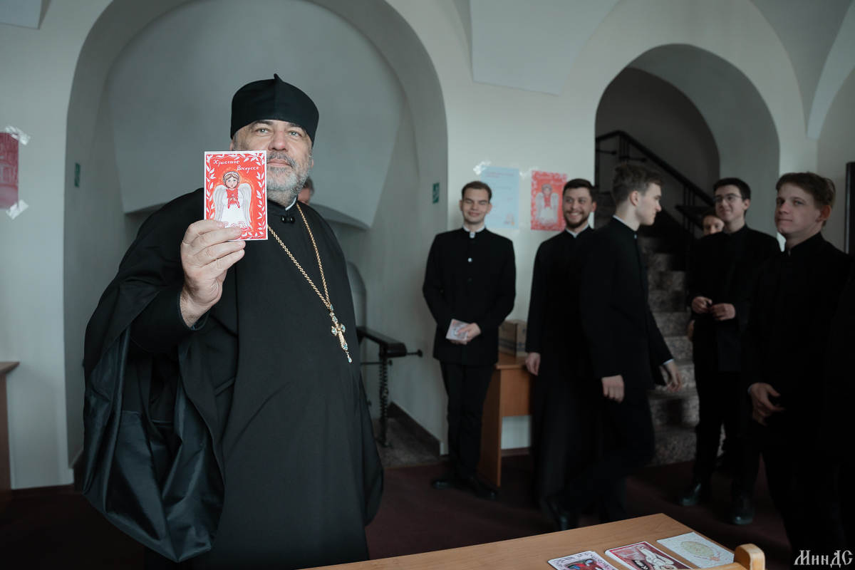 top.jpgВ преддверии праздника Светлого Христова Воскресения по благословению ректора Минской духовной семинарии протоиерея Виктора Василевича прошла ежегодная акция «Пасхальная открытка», которая традиционно объединяет не только студентов семинарии и учащихся различных учебных заведений Беларуси, но и всех желающих порадовать своих родных и близких. Изображения для открыток готовят преподаватели и студенты Отделения церковных искусств.